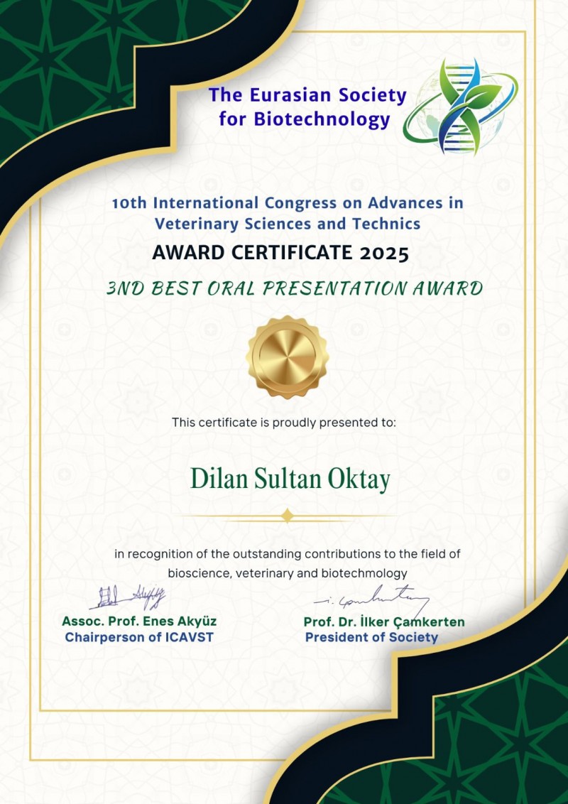 21–25 Temmuz 2025 tarihleri arasında Bosna-Hersek’in başkenti Saraybosna’da düzenlenen 10th International Congress on Advances in Veterinary Sciences & Technics (ICAVST 2025) kongresinde, Veteriner Fakültesi yüksek lisans öğrencisi Dilan Sultan Oktay’ın “Closure of palatal defect in a cat using a nasal septal button: mid-term clinical and CT evaluation” başlıklı sözlü sunumu, “En İyi Sözlü Sunum Üçüncülük Ödülü”ne layık görüldü.