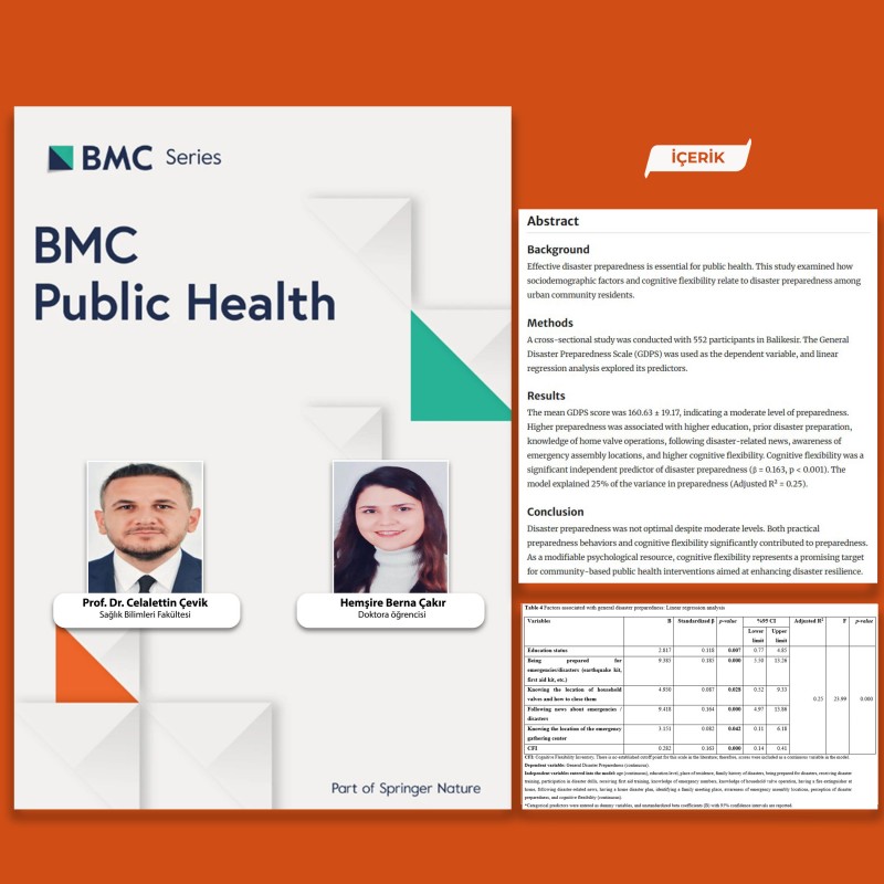 BAÜN akademisyenlerinden Prof. Dr. Celalettin Çevik ve Bursa Uludağ Üniversitesi Halk Sağlığı Hemşireliği Anabilim Dalı doktora öğrencisi Berna Çakır’ın birlikte yürüttüğü “Toplumun Afetlere Hazırlığını Anlamak: Bilişsel Esneklik Bir Çözümü mü?” başlıklı çalışma, uluslararası dergi sıralamalarında en üst dilimlerden olan Q1 kategorisindeki “BMC Public Health” dergisinde yayımlandı.