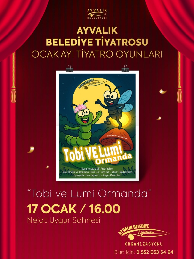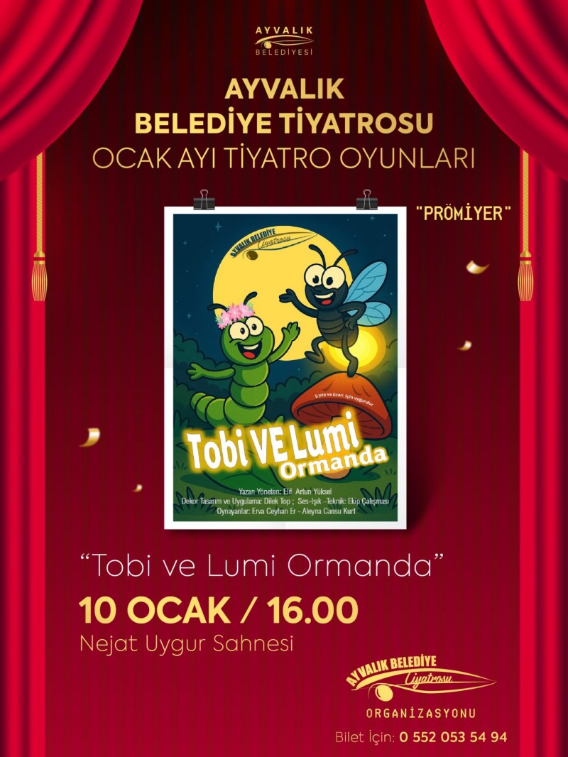 Ayvalık Belediye Tiyatrosu’nun başarılı oyun yazarı Elif Artun Yüksel’in kaleme aldığı ve yönetmenliğini üstlendiği Tobi ve Lumi Orman’da isimli çocuk oyunu 10 Ocak Cumartesi günü, saat 16.00’da Vural Sineması Nejat Uygur Sahnesi’nde “perde” diyecek.