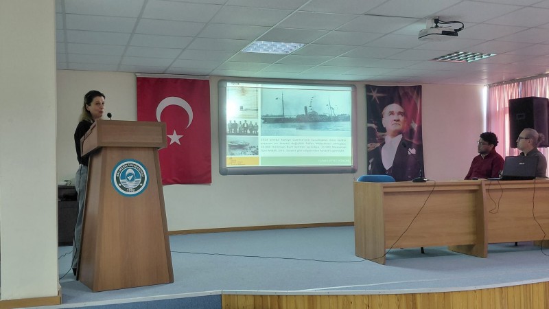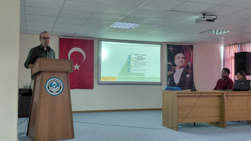 Sunumda, Ayvalık Endüstriyel Peyzajı’nın UNESCO Dünya Mirası çerçevesinde ele alınış süreci, alana yönelik koruma yaklaşımları ve alan yönetimi uygulamaları kapsamlı biçimde aktarıldı. Öğrenciler, kültürel mirasın korunmasında bütüncül planlama, sürdürülebilirlik ve yerel değerlerin önemi üzerine bilgi edinme fırsatı buldu.