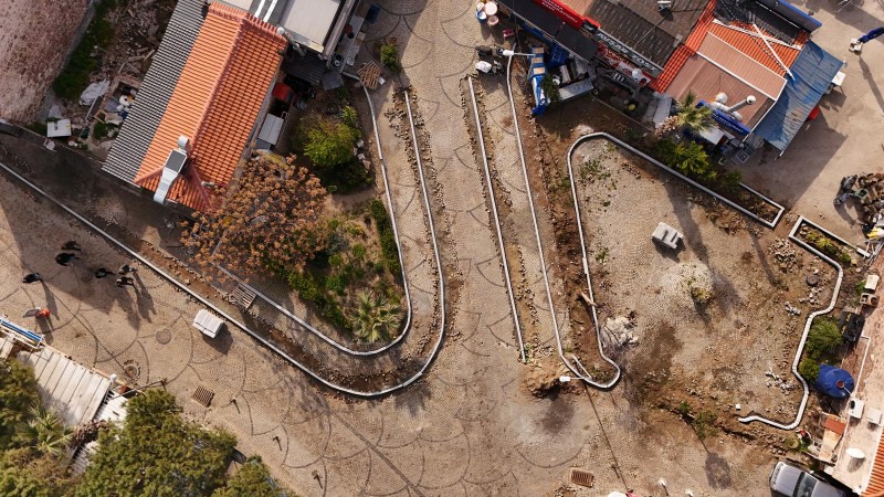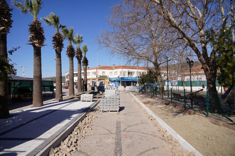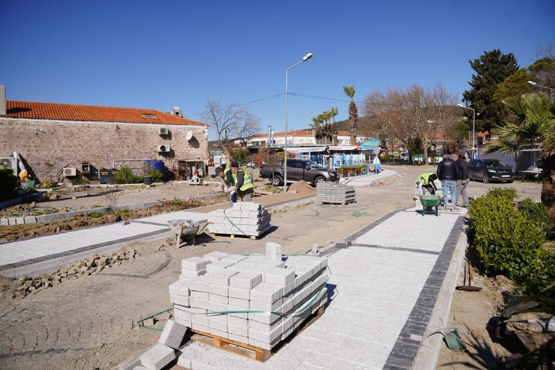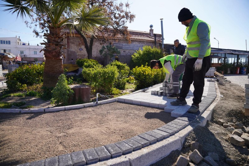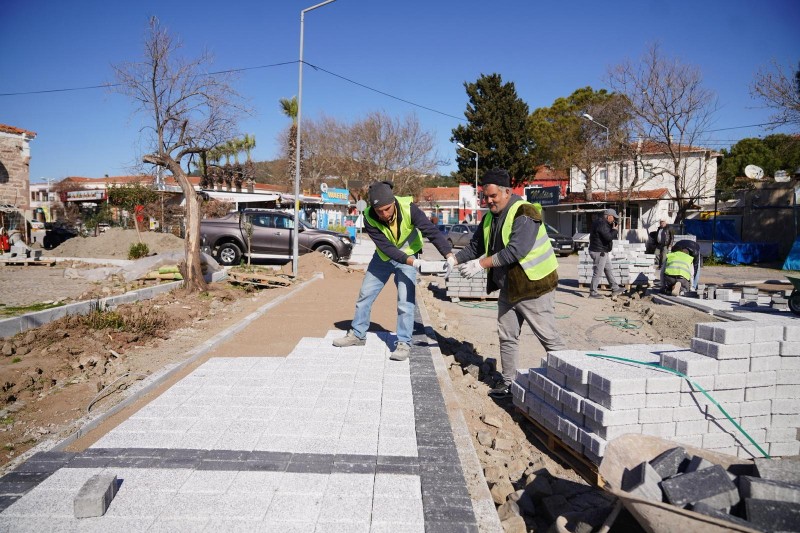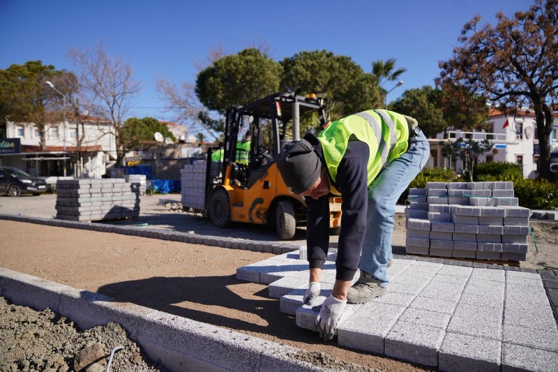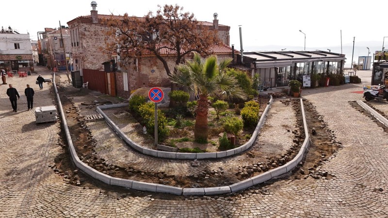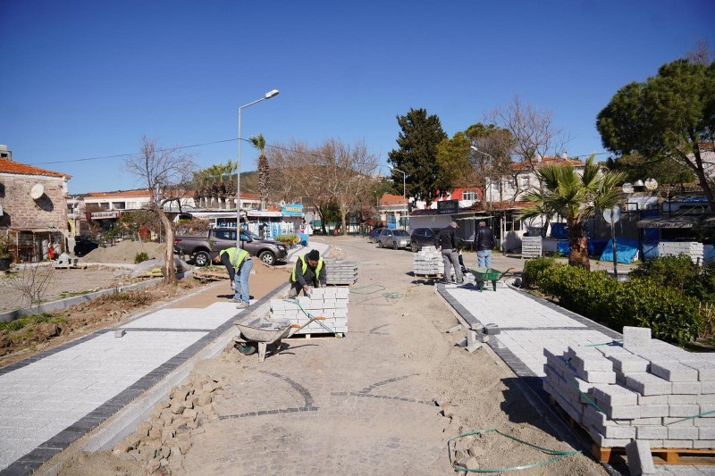 Alibey (Cunda) Adası’nda, Eski Yol Giriş Meydanı ile Ali Çetinkaya Meydanı arasında planlanan; kaldırım, çiçeklik, aydınlatma ve park düzenlemelerine yönelik çalışmaları titizlikle yürüten ekipler, azami dikkat sarf ederek çevreyi rahatsız etmeden taş ve bordür döşemelerini gerçekleştiriyor.