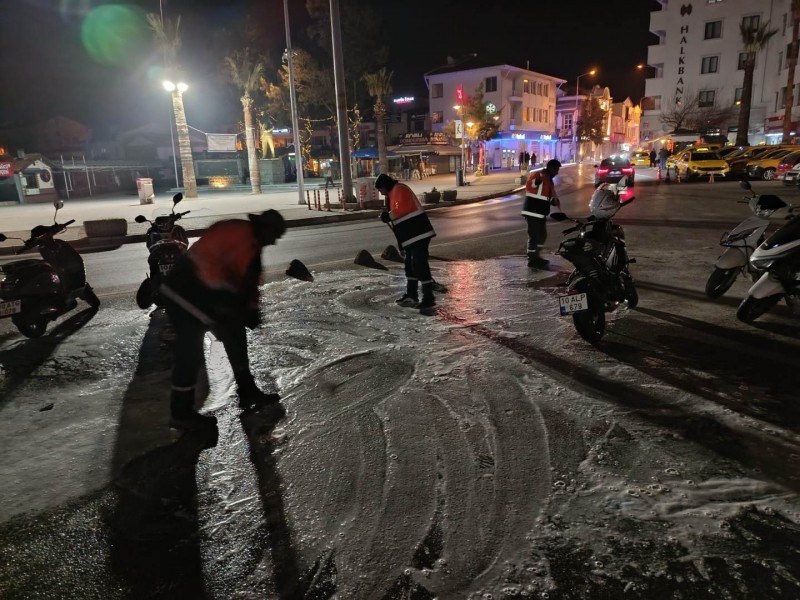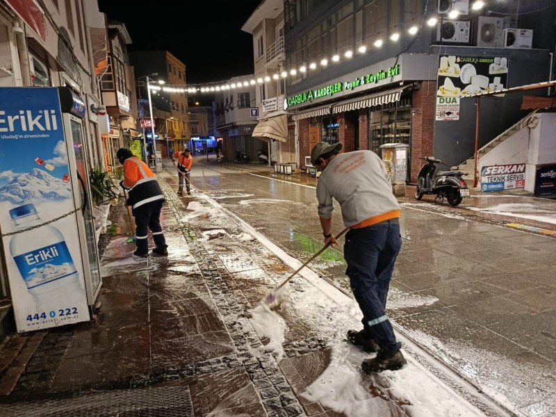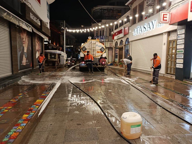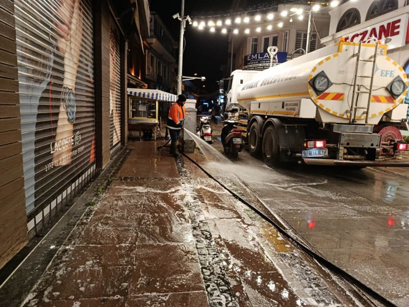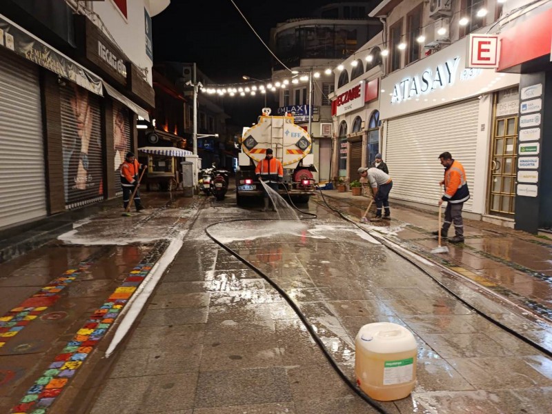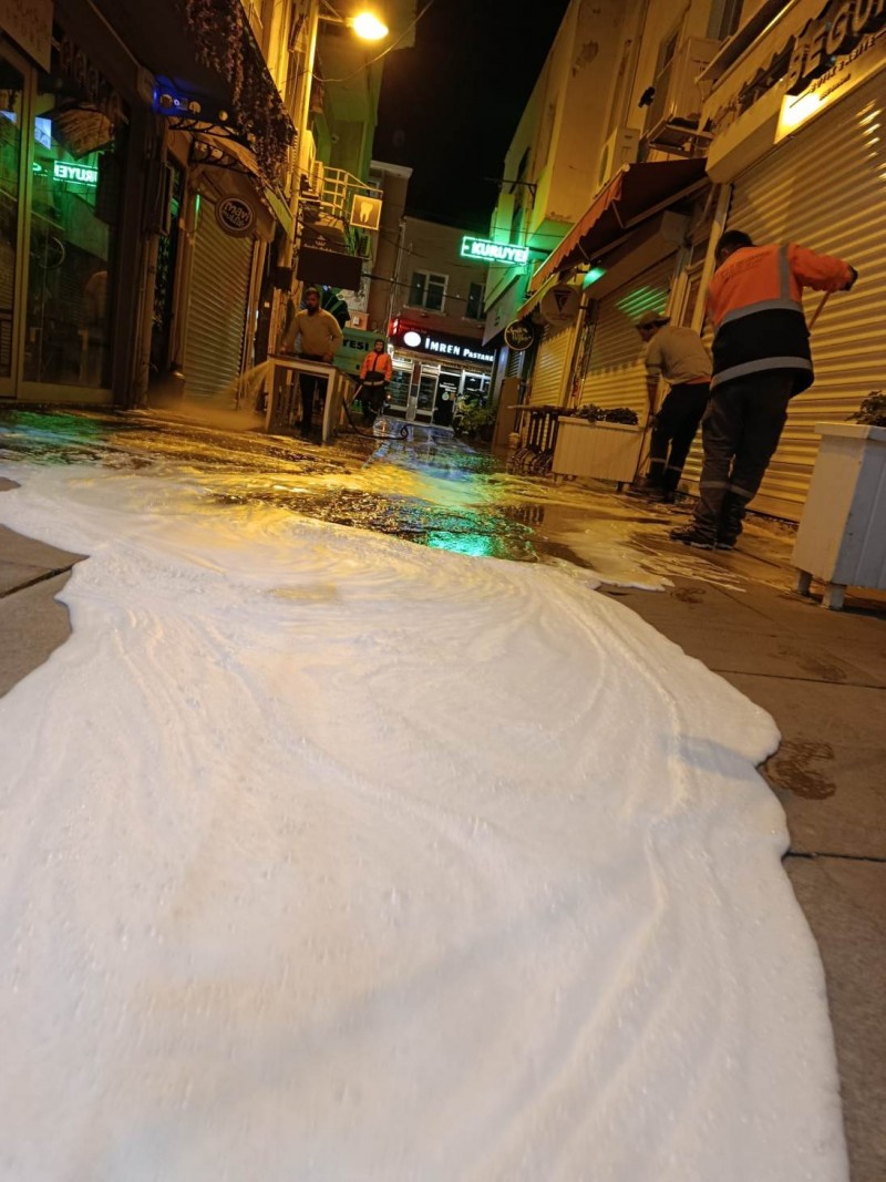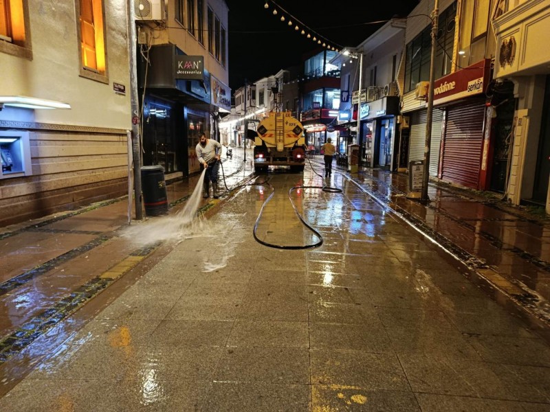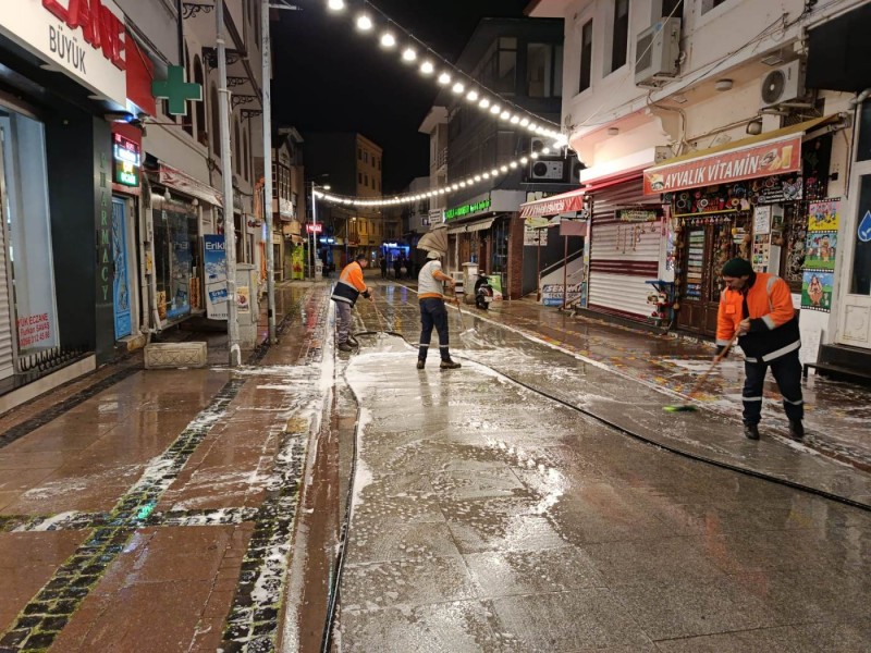 Öte yandan Ayvalık’ın en işlek noktalarından biri olan Talatpaşa Caddesi, yapılan temizlik çalışmalarının ardından köpüklü suyla yıkanarak bayram öncesinde pırıl pırıl bir görünüme kavuşturuldu.