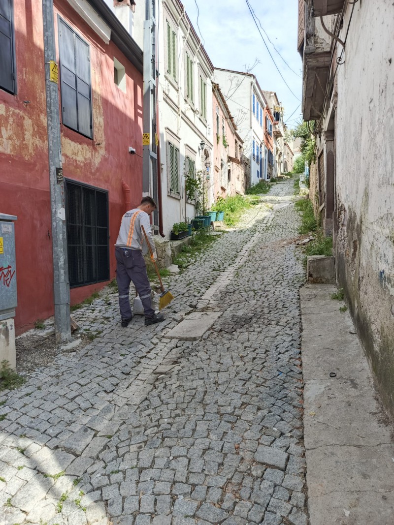 Ayvalık Belediyesi, kent genelinde yürüttüğü kapsamlı temizlik çalışmalarıyla Ayvalık Merkez’de mıntıka temizliğini aralıksız sürdürüyor. Sabahın erken saatlerinden itibaren sahaya çıkan ekipler, sokakları adım adım temizleyerek hem çevre sağlığını koruyor hem de kent estetiğine katkı sunuyor. Vatandaşların daha sağlıklı ve hijyenik bir ortamda yaşamlarını sürdürebilmeleri amacıyla yapılan çalışmalar, belirlenen program dahilinde düzenli olarak gerçekleştiriliyor.
