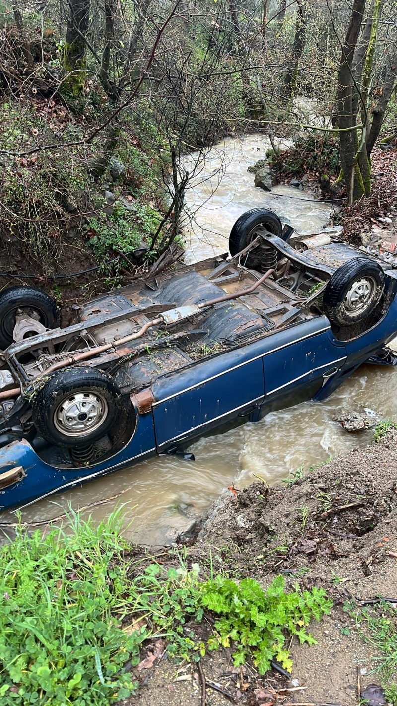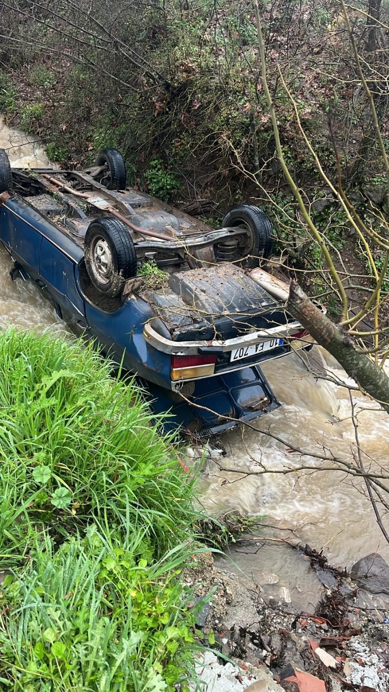 Balıkesir'in Sındırgı ilçesinde dere içerisinde ters dönmüş otomobil ve 50 metre ilerisinde bir erkek cesedi bulundu.
