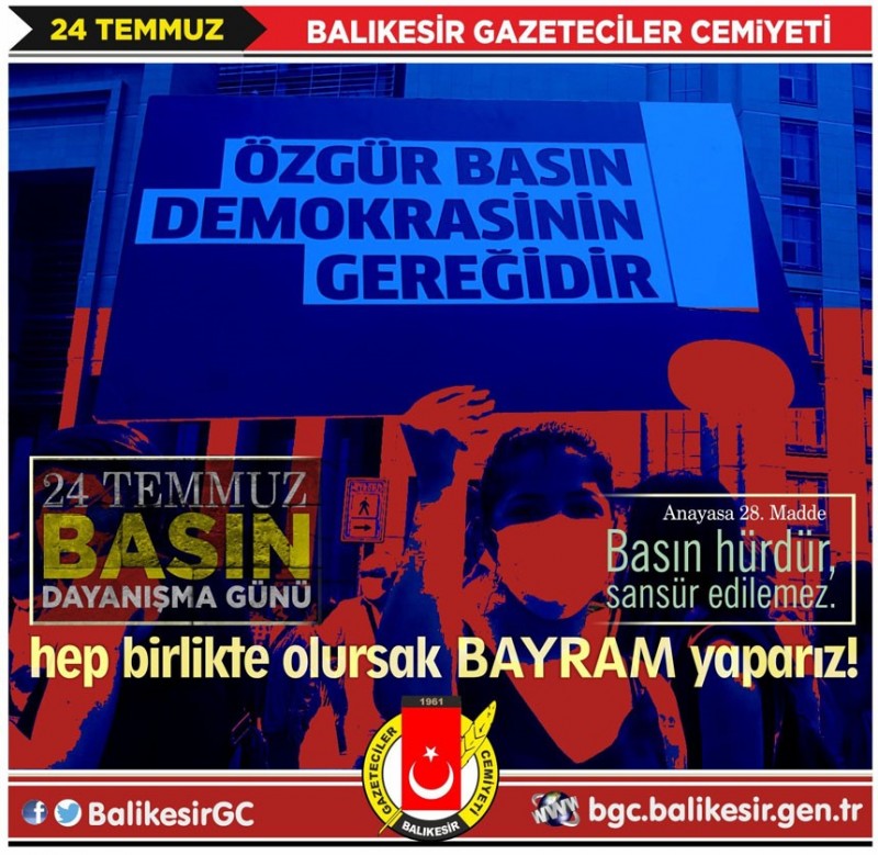 Balıkesir Gazeteciler Cemiyeti (BGC) Başkanı Ramazan Demir, Türk basınında sansürün kaldırılışının 115. yılı nedeniyle mesaj yayınladı. Başkan Demir mesajında, 1908'deki direniş sonrası ilk yıllarda “Basın Bayramı” olarak kutlanan 24 Temmuz'un, basın özgürlüğü ve basın emekçilerinin haklarında kısıtlanmaya gidilmesi üzerine "Basın Dayanışma Günü" olarak kutlamaya başladığını hatırlattı.