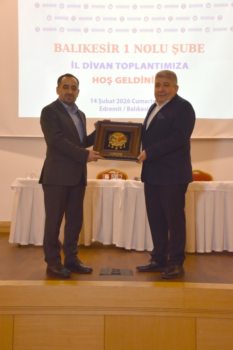 Divan Toplantısı Eğitim-Bir-Sen tanıtım filminin gösteriminin ardından, selamlama ve değerlendirme konuşması yapmak üzere Eğitim-Bir-Sen Balıkesir 1Nolu Şube Başkanı Ercan Kurter’in konuşması ile başladı. Kurter konuşmasının başında, gerek ülke genelinde gerekse Balıkesir özelinde yetkiyi elinde bulunduran teşkilat olarak emeğin ve emekçinin her zaman yanında olduklarını ifade etti. Başkan Kurter konuşmasına şöyle devam etti: "Temel hak ve özgürlükleri savunan, mali, sosyal ve özlük haklarını artıran, sağladığı 100 kazanımla eğitim çalışanlarının hakkının, itibarının, emeğinin, alın terinin teminatı olan bir sendikayız. Mevcut sorunların çözümünü sağlayacak olan da biziz. Toplu sözleşme hakkını alan, eksiklerine rağmen Öğretmenlik Meslek Kanunu için adım atılmasını sağlayan, 3600 ek göstergenin mimarı olan bir teşkilatız. Sözleşmelilerin kadroya geçirilmesini, nöbet görevine ücret ödenmesini sağlayan, öğretmen ve öğretim elemanlarının ek ödemelerini artıran, sınıf öğretmenlerine haftada iki saat ilave ek ders ücreti ödenmesini, toplu sözleşme ikramiyesi ile örgütlülüğü anlamlı kılan ve üyeye kazanç sağlayan da biziz" şeklinde konuştu.
