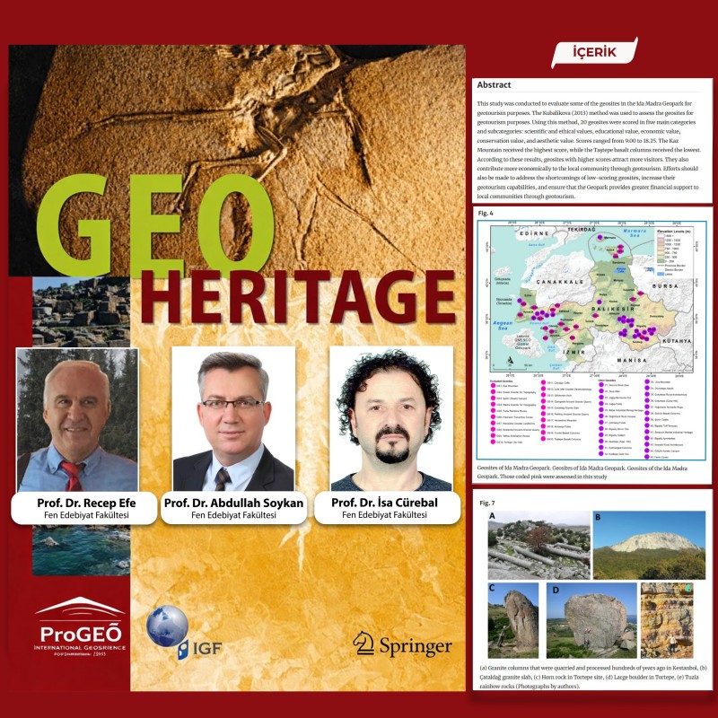 BAÜN akademisyenlerinden Prof. Dr. Recep Efe, Prof. Dr. Abdullah Soykan ve Prof. Dr. İsa Cürebal tarafından ortaya konulan “Geosite Assessment for Geotourism Purposes: Case Study of Ida Madra Geopark, Türkiye” başlıklı çalışma, uluslararası dergi sıralamasının en üst dilimlerinden olan SCIE-Q2 kategorisindeki “Springer GeoHeritage” dergisinde yayımlandı.