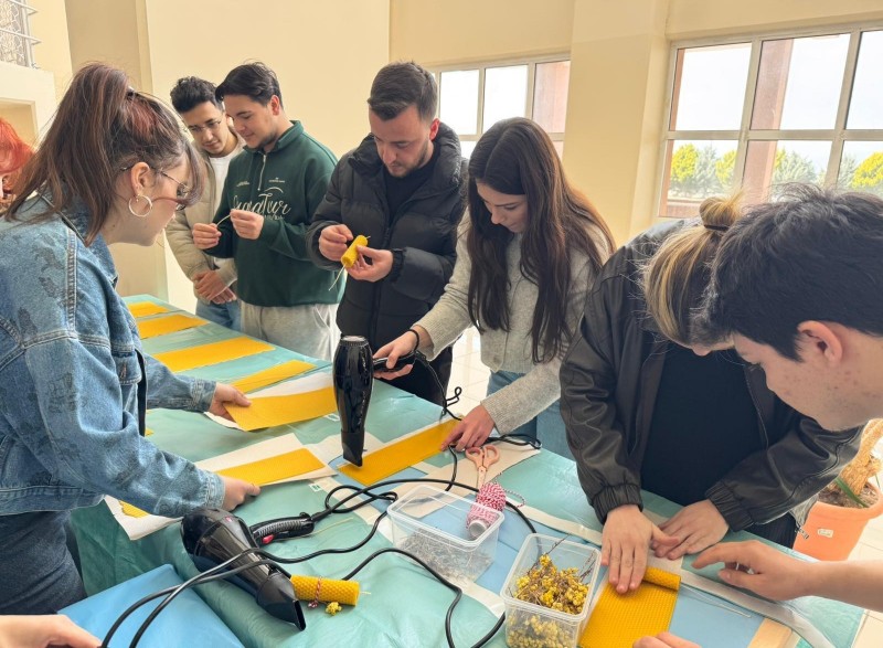 Balıkesir Üniversitesi Burhaniye Uygulamalı Bilimler Fakültesinde (BUBFA), BUBFA Eko Yaşam Kulübü tarafından düzenlenen “Bal Mumu Yapımı” etkinliği öğrencilerin yoğun katılımıyla gerçekleştirildi. Doğal ve sürdürülebilir üretim anlayışına dikkat çekmek amacıyla gerçekleştirilen etkinlikte katılımcılar, bal mumunun özellikleri ve kullanım alanları hakkında bilgi edinme fırsatı buldu. Etkinlik kapsamında öğrenciler, doğal bal mumunu kullanarak geleneksel yöntemlerle kendi mumlarını üretme deneyimi yaşadı.