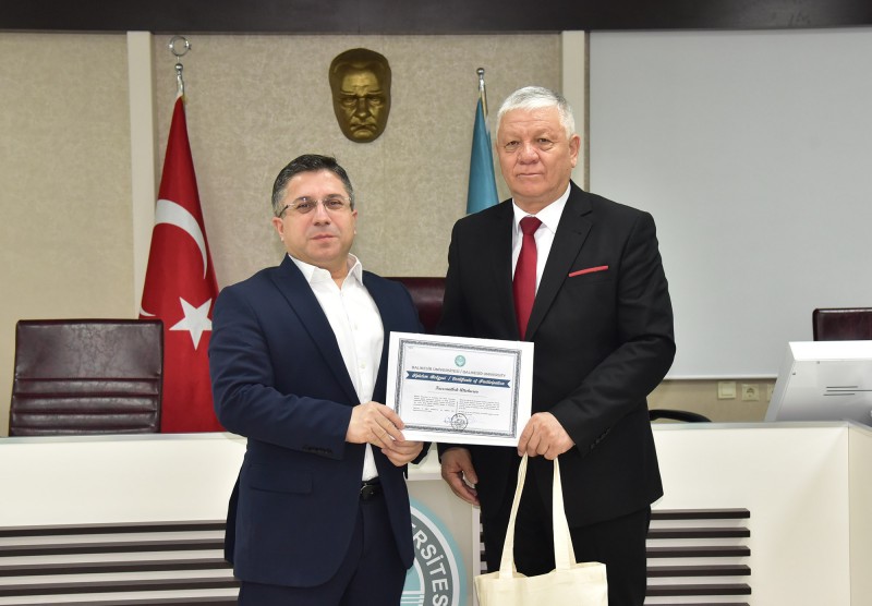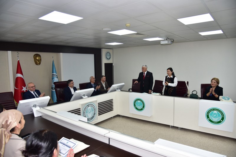 PROGRAMIN SONUNDA KATILIMCILARA SERTİFİKALARI REKTÖR PROF. DR. YÜCEL OĞURLU TARAFINDAN TAKDİM EDİLDİ. REKTÖR OĞURLU, KONUK AKADEMİSYENLERİ ÜNİVERSİTEDE AĞIRLAMAKTAN DUYDUKLARI MEMNUNİYETİ İFADE EDEREK TÜRK DÜNYASI ÜNİVERSİTELERİ ARASINDAKİ AKADEMİK İŞ BİRLİKLERİNİN GÜÇLENMESİNİN BİLİMSEL ÜRETİM VE BİLGİ PAYLAŞIMI AÇISINDAN ÖNEMLİ KATKILAR SUNDUĞUNU BELİRTTİ. KONUK AKADEMİSYENLER İSE PROGRAM SÜRESİNCE KENDİLERİNE GÖSTERİLEN İLGİ VE MİSAFİRPERVERLİK DOLAYISIYLA TEŞEKKÜR EDEREK GERÇEKLEŞTİRİLEN AKADEMİK TEMASLARIN İKİ ÜNİVERSİTE ARASINDAKİ İŞ BİRLİĞİNİN GELİŞMESİNE ÖNEMLİ KATKI SAĞLAYACAĞINI İFADE ETTİ.