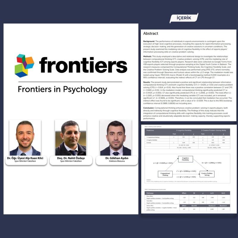 BAÜN akademisyenlerinden Dr. Öğr. Üyesi Alp Kaan Kilci, Doç. Dr. Nahit Özdayı, Doktora mezunu Dr. Gökhan Aydın, Gazi Üniversitesi akademisyenlerinden Öğr. Gör. Mehmet Yönal, Çanakkale Onsekiz Mart Üniversitesi akademisyenlerinden Doç. Dr. Ender Ali Uluç, Öğr. Gör. Ferhat Aktaş, Öğr. Gör. Serkan Aksoy, Demiroğlu Bilim Üniversitesi akademisyenlerinden Dr. Öğr. Üyesi Seyhan Bekir ve Afyonkarahisar Gençlik ve Spor İl Müdürlüğü Orhan Küçük tarafından yürütülen “Mediating Role of Cognitive Flexibility in the Relationship Between Computational Thinking and Creative Problem Solving in Esports Players” başlıklı çalışma, uluslararası dergi sıralamalarında en üst dilim olan Q1 ölçeğindeki Frontiers in Psychology dergisinde yayımlandı.