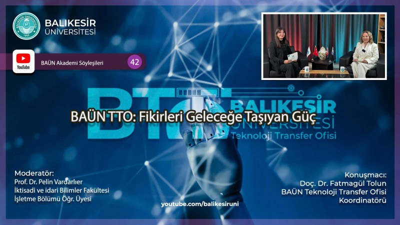 Balıkesir Üniversitesi (BAÜN) Basın ve Halkla İlişkiler Müdürlüğünün yapım ve yönetimini gerçekleştirdiği ve Balıkesir Üniversitesi YouTube kanalından yayınlanan ‘’Akademi Söyleşileri’’ program serisinin yeni yayını, “BAÜN TTO: Fikirleri Geleceğe Taşıyan Güç” başlıklı program oldu.