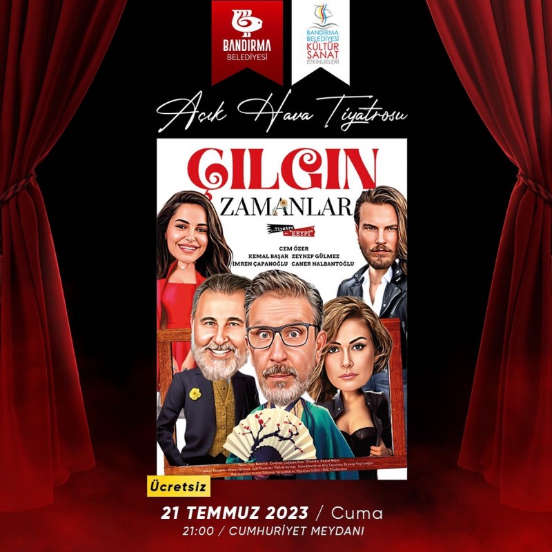 Aldatan ve aldatılan bir çiftin yaşadığı olayları komedi penceresinden ele alan ve başrollerini Cem Özer, Kemal Başar, Zeynep Gülmez, İmren Çapanoğlu ve Caner Nalbantoğlu'nun paylaştığı "Çılgın Zamanlar" tiyatro oyunu 21 Temmuz Cuma günü, saat 21.00'de Cumhuriyet Meydan'ında Bandırmalı tiyatroseverlerle buluşuyor.