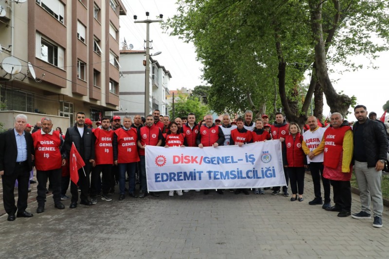 Sabah saatlerinde Vergi Dairesi önünde toplanan sendikalar, siyasi partiler, sivil toplum kuruluşları, işçiler, Edremit Belediye Başkanı Mehmet Ertaş, belediye başkan yardımcıları ve belediye meclis üyeleri kortej yürüyüşüne katıldı.