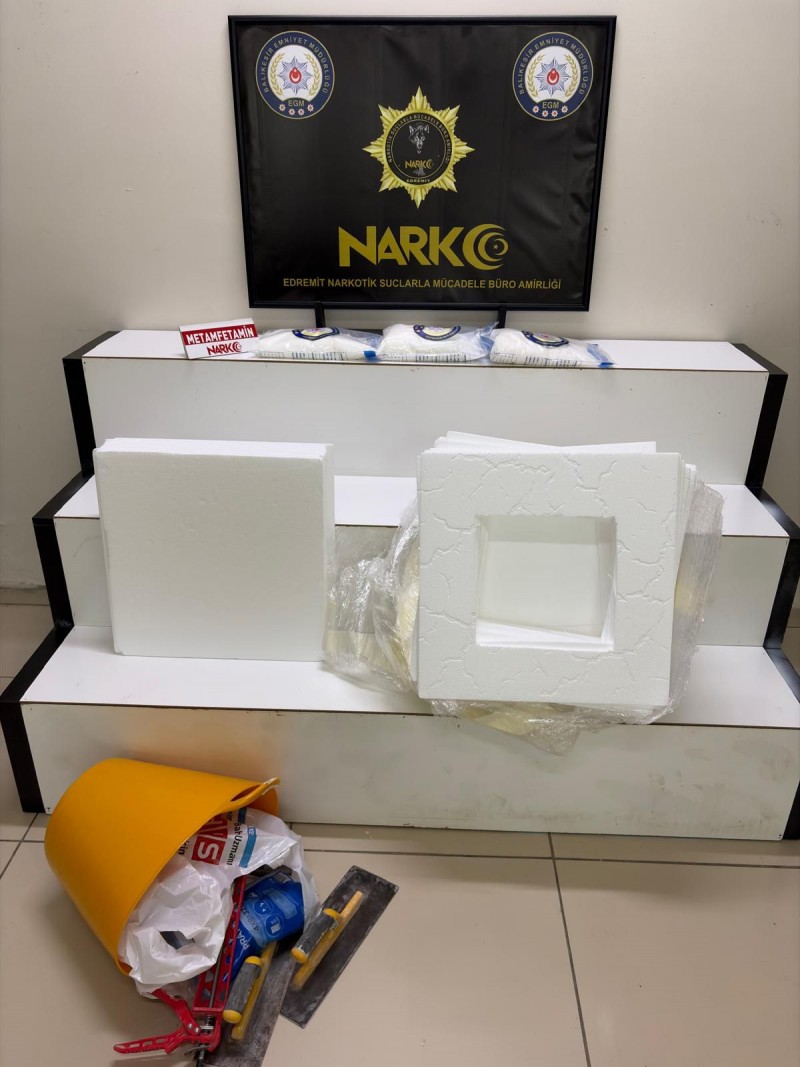 Edremit Narkotik Suçlarla Mücadele Şube Müdürlüğü ekipleri, şüphe üzerine durdurdukları bir yolcunun eşyaları ve üzerinde arama yaptı. Aramada, strafor inşaat köpüğüne gizlenmiş 3 paket halinde 3 kilo metamfetamin bulundu.
