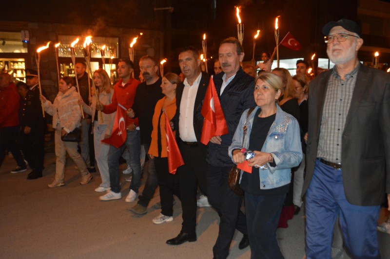 Yaya Mahallesi’nde ilçe merkezindeki Cumhuriyet Meydanı’na kadar süren yürüyüşte, ellerinde meşalelerle yürüyen vatandaşlara öğrencilerde dev Türk Bayrağı ve Atatürk fotoğrafı da eşlik etti.