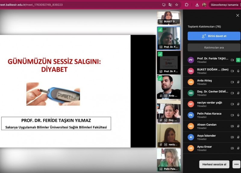 İvrindi Sağlık Hizmetleri Meslek Yüksekokulu ile Fizyoterapi ve Rehabilitasyon Topluluğu iş birliğiyle düzenlenen “Diyabette Üç Adım: Bakım, Egzersiz, Beslenme” paneli, öğrencilerin ve akademisyenlerin yoğun katılımıyla çevrim içi olarak gerçekleştirildi. Açılış konuşmalarını İvrindi Sağlık Hizmetleri Meslek Yüksekokulu Müdürü Doç. Dr. Pelin Palas Karaca ve Fizyoterapi ve Rehabilitasyon Topluluğu Başkanı Simay Cansoy yaptığı panelin moderatörlüğünü Öğr. Gör. Ayşe Buket Doğan Aktaş üstlendi.