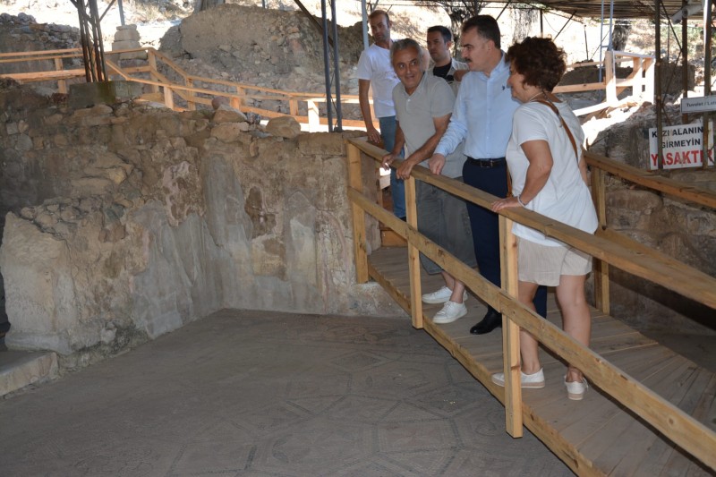 Altınoluk Tarihi Antandros Şehrini Koruma, Kurtarma ve Yaşatma Derneği Başkanı Z. Gülçin Cömert’in eşlik ettiği antik kent ziyaretinde Kaymakam Odabaş, 'Yamaç ev' olarak adlandırılan Roma villası ile geçtiğimiz aylarda yeni bulunan Roma Villasını, kazı alanını ve nekropolis’i (mezarlık) gezerek tarihi kalıntıları yerinde inceleyerek yetkilerden bilgiler aldı.