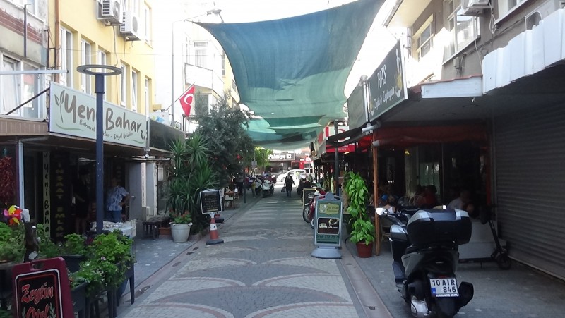 Edremit'te son günlerde yaşanan çöl sıcaklıkları nedeniyle sıcaklıklar mevsim normallerinin üzerine çıkınca sıcaktan bunalan esnaf çarşıda bir sokağın üzerine serinlemek için zeytin brandaları ile kapattılar.