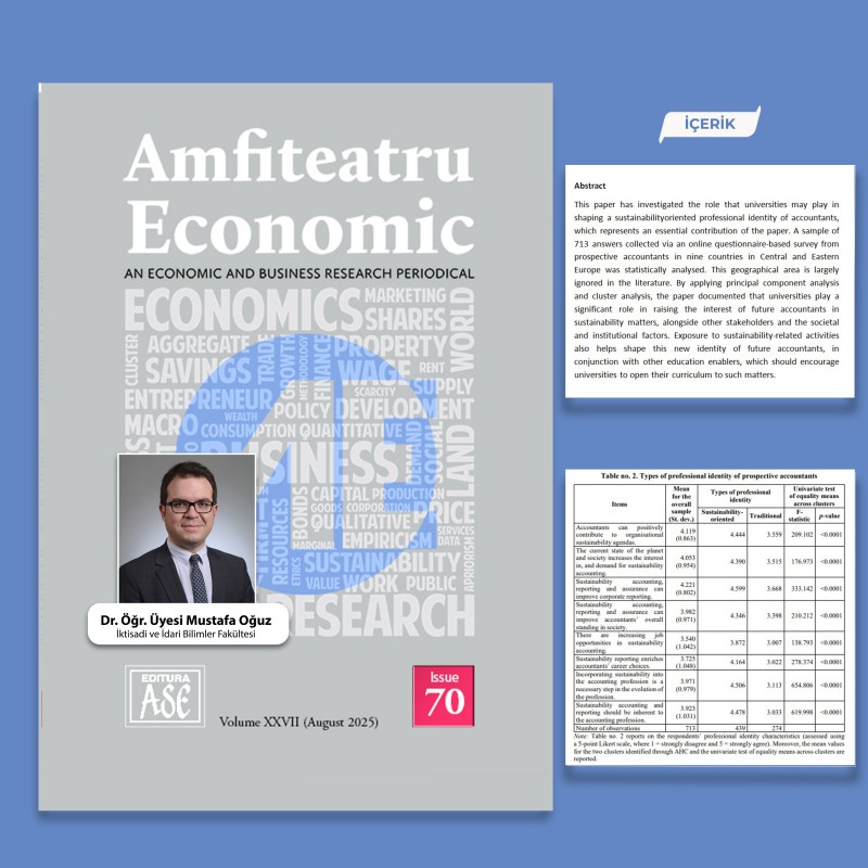 BAÜN akademisyenlerinden Dr. Öğr. Üyesi Mustafa Oğuz’un yanı sıra Bucharest University of Economic Studies akademisyenlerinden Cătălin-Nicolae Albu, Gina Raluca Gușe ve Elena Turuianu, Dokuz Eylül Üniversitesi akademisyenlerinden Prof. Dr. Çağnur Balsarı, University of Sarajevo akademisyenlerinden Meliha Bašić, Ss. Cyril and Methodius University in Skopje akademisyenlerinden Zorica Bozhinovska Lazarevska ve Ivan Dionisijev, University of Ljubljana akademisyenlerinden Sandra Damijan ve Metka Tekavcic, University of Zagreb akademisyenlerinden Nikolina Dečman, University of Economics in Katowice akademisyenlerinden Olga Grzybek ve University of Montenegro akademisyenlerinden Ana Lalević Filipović, University of Split akademisyenlerinden Ivana Perica, University of Belgrade akademisyenlerinden Savka Vuckovic Milutinovic’in yer aldığı “Educating Accountants with a Sustainability-Oriented Professional Identity in Central and Eastern Europe” (Orta ve Doğu Avrupa’da Sürdürülebilirlik Odaklı Mesleki Kimliğe Sahip Muhasebecilerin Eğitimi) başlıklı çalışma, uluslararası dergi sıralamasının en üst dilimlerinden olan Q2 ölçeğindeki "Amfiteatru Economic – An Economic and Business Research Periodical" dergisinde yayımlandı.