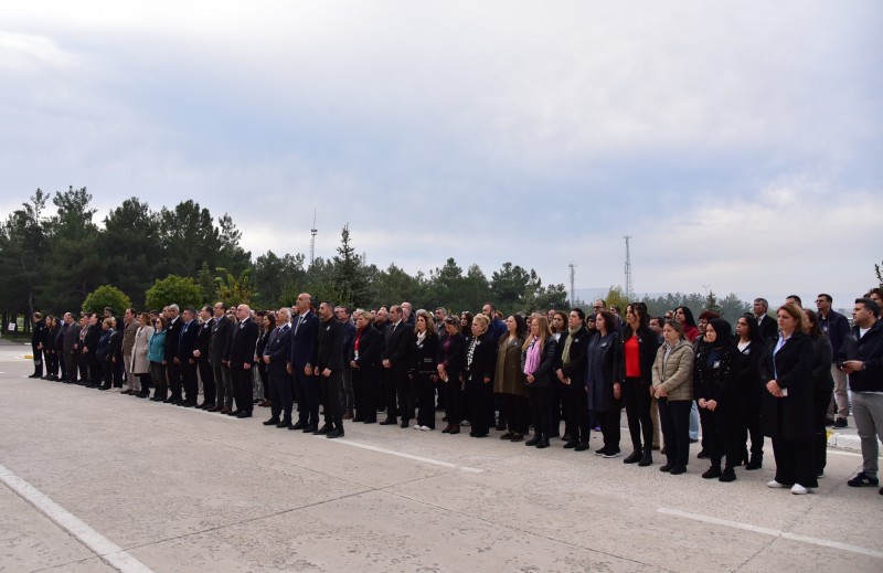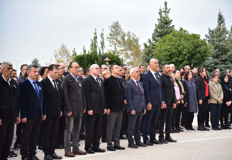 Rektörlükteki anma töreninde Rektör Yardımcıları Prof. Dr. Cevdet Avcıkurt, Prof. Dr. Murat Doğdubay, Prof. Dr. Fatih Satıl, Tıp Fakültesi Dekanı Prof. Dr. Volkan Yüksel, Veteriner Fakültesi Dekanı Prof. Dr. Ziya İlhan, Mühendislik Fakültesi Dekanı Prof. Dr. Aslan Deniz Karaoğlan, Genel Sekreter Yemliha Yanar, akademik ve idari personel yer aldı. Programda Rektör Yardımcısı Prof. Dr. Murat Doğdubay bir konuşma yaparak 10 Kasım’ın Atatürk’ü anma günü olmakla birlikte aynı zamanda Cumhuriyetimizin temel değerlerini koruma ve gelecek nesillere aktarma sorumluluğunu da hatırlattığının altını çizdi. Rektör Yardımcısı Prof. Dr. Murat Doğdubay; “Atatürk, yalnızca bir devlet adamı değil, aynı zamanda bilimin, eğitimin ve aklın yol göstericisidir. Onun önderliğinde kazanılan bağımsızlık ve kurulan Cumhuriyet, bizlere özgür düşünceyi, eşitliği ve topluma sorumluluğu öğretmiştir. Üniversite olarak bizler, bu mirası bilgi üretkenlik ve topluma sorumluluk çerçevesinde sürdürmekle yükümlüyüz” şeklinde konuştu.