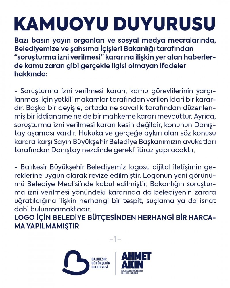 Balıkesir Büyükşehir Belediyesi, İçişleri Bakanlığı tarafından logo değişikligi sonrası Başkan Ahmet Akın hakkında verilen "soruşturma izni" ile ilgili bir açıklama yaptı.