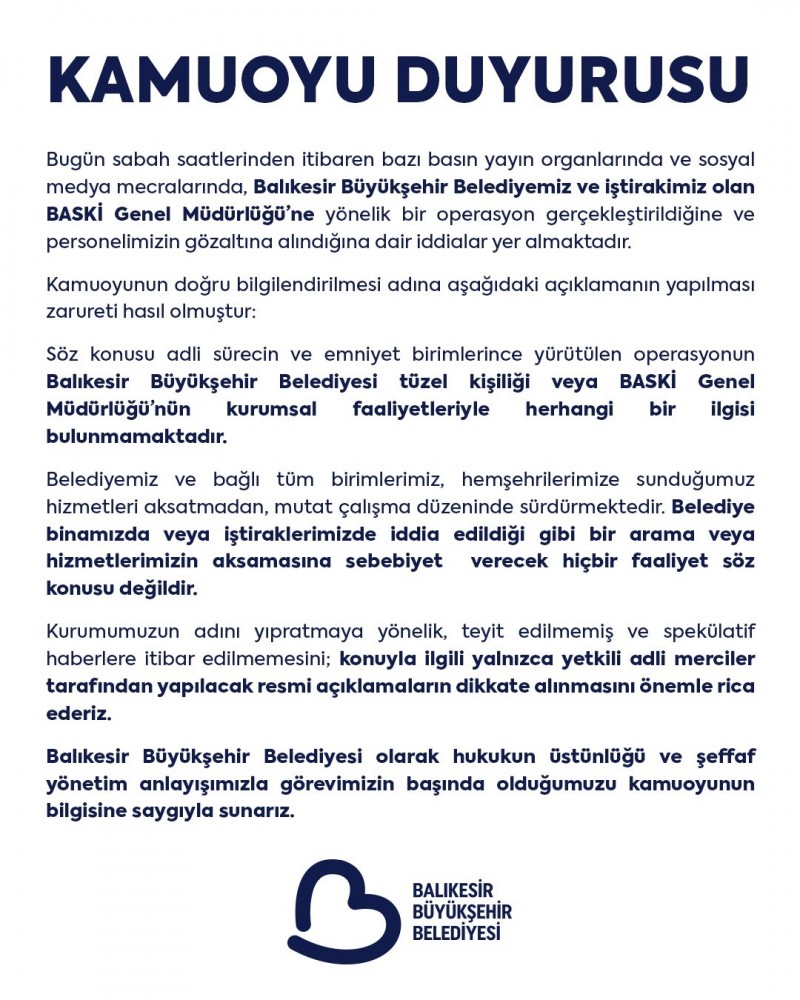 Operasyon ardından Balıkesir Büyükşehir Belediyesi'nden yazılı açıklama yapıldı. Açıklamada, "Bazı basın yayın organlarında ve sosyal medya mecralarında, Balıkesir Büyükşehir Belediyemiz ve iştirakimiz olan BASKİ Genel Müdürlüğü'ne yönelik bir operasyon gerçekleştirildiğine ve personelimizin gözaltına alındığına dair iddialar yer almaktadır. Söz konusu adli sürecin ve emniyet birimlerince yürütülen operasyonun Balıkesir Büyükşehir Belediyesi tüzel kişiliği veya BASKİ Genel Müdürlüğü'nün kurumsal faaliyetleriyle herhangi bir ilgisi bulunmamaktadır. Belediyemiz ve bağlı tüm birimlerimiz, hemşehrilerimize sunduğumuz hizmetleri aksatmadan, mutat çalışma düzeninde sürdürmektedir. Belediye binamızda veya iştiraklerimizde iddia edildiği gibi bir arama veya hizmetlerimizin aksamasına sebebiyet  verecek hiçbir faaliyet söz konusu değildir. Kurumumuzun adını yıpratmaya yönelik, teyit edilmemiş ve spekülatif haberlere itibar edilmemesini; konuyla ilgili yalnızca yetkili adli merciler tarafından yapılacak resmi açıklamaların dikkate alınmasını önemle rica ederiz. Balıkesir Büyükşehir Belediyesi olarak hukukun üstünlüğü ve şeffaf yönetim anlayışımızla görevimizin başında olduğumuzu kamuoyunun bilgisine saygıyla sunarız" denildi.
