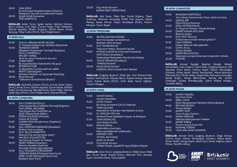 Avlu Kongre ve Kültür Merkezi’nde 17-26 Ekim tarihleri arasında her gün 10.00 ila 21.00 saatleri arasında ziyarete açılacak olan fuarın açılış töreni 17 Ekim 2025 Cuma günü saat 18.00’de yapılacak 10 gün sürecek fuarda Ayşe Kulin, Ataol Behramoğlu ve Prof. Dr. Yılmaz Büyükerşen onur konuğu olacak.Aralarında Ahmet Ümit, Ercan Kesal, Sinan Meydan, Nebil Özgentürk, Erol Mütercimler, Nilüfer Açıkalın, Nurullah Genç, Öner Yağcı, Ramazan Kurtoğlu, Haldun Solmaztürk, İlker Başbuğ, Cihat Yaycı, Naim Babüroğlı, Yalçın Karatepe, Zeynep Altıok, Aytunç Erkin, Banu Avar, Can Coşkun, Can Uğur, Cem Özkeskin, Gökmen Karadağ, İrfan Değirmenci, Mehmet Ali Güller, Mustafa Balbay, Murat Ağırel, Necdet Saraç, Sedef Kabaş, Serap Belovacıklı, Serpil Yılmaz, Sinem Fıstıkoğlu, Yavuz Oğhan gibi kamuoyunun yakından tanıdığı birçok yazar ve gazeteci 1. Balıkesir Kitap Fuarı’nda hem kitaplarını imzalayacak hem de farklı konularda söyleşi yapacaklar. Fuarın programı Balıkesir Büyükşehir sosyal medya hesaplarından ve LED ekranlardan takip edilebilecek.