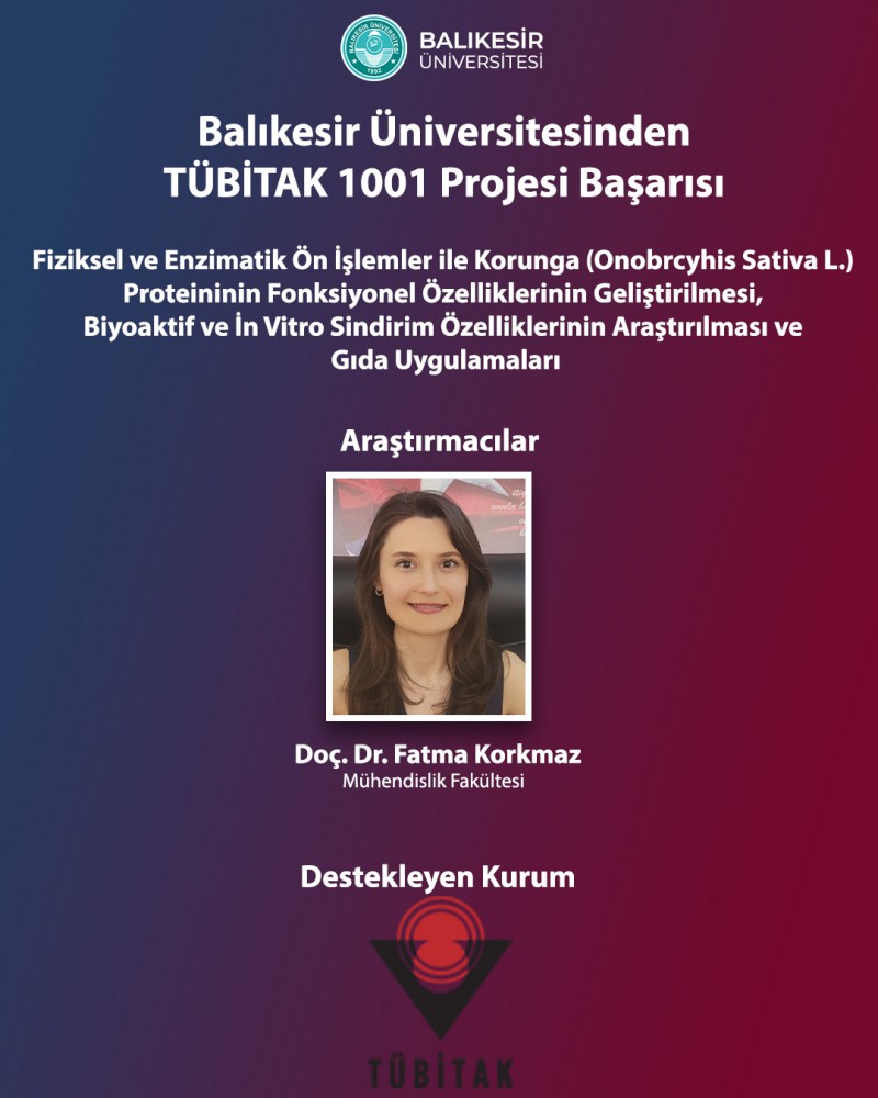 Balıkesir Üniversitesi (BAÜN) Mühendislik Fakültesi Gıda Mühendisliği Bölümü akademisyenlerinden Doç. Dr. Fatma Korkmaz'ın araştırmacı, Çanakkale Onsekiz Mart Üniveristesi akademisyenlerinden Prof. Dr. Necati Barış Tuncel’in yürütücü ve İzmir Yüksek Teknoloji Enstitüsü akademisyenlerinden Doç. Dr. Şükrü Güleç ve Arş. Gör. Dr. Cansu Özel’in araştırmacı olarak görev aldığı “Fiziksel ve Enzimatik Ön İşlemler ile Korunga (Onobrcyhis Sativa L.) Proteininin Fonksiyonel Özelliklerinin Geliştirilmesi, Biyoaktif ve İn Vitro Sindirim Özelliklerinin Araştırılması ve Gıda Uygulamaları” adlı proje TÜBİTAK 1001 Bilimsel ve Teknolojik Araştırma Projelerini Destekleme Programı kapsamında desteklenmeye layık görülmüştür.