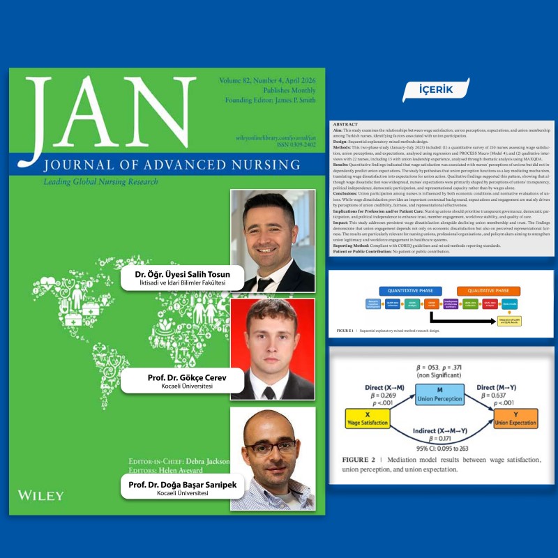 BAÜN akademisyenlerinden Dr. Öğr. Üyesi Salih Tosun, Kocaeli Üniversitesi akademisyenlerinden Prof. Dr. Gökçe Cerev ve Prof. Dr. Doğa Başar Sarıipek ile birlikte yürüttüğü “From Wage Dissatisfaction to Union Expectations: The Mediating Role of Union Perception Among Nurses” başlıklı çalışma, uluslararası dergi sıralamalarında en üst dilim olan SSCI - Q1 kategorisindeki JAN (Journal of Advanced Nursing) dergisinde yayımlandı.