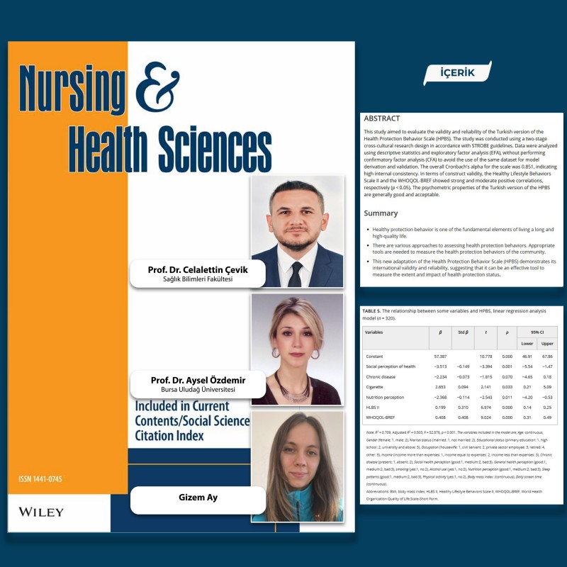 BAÜN akademisyenlerinden Prof. Dr. Celalettin Çevik, yüksek lisans öğrencisi Gizem Ay ve Bursa Uludağ Üniversitesi akademisyenlerinden Prof. Dr. Aysel Özdemir tarafından ortaya koyulan “Psychometric Evaluation of the Turkish Version of the Health Protection Behavior Scale (Sağlığı Koruma Davranış Ölçeği’nin Türkçe Versiyonunun Psikometrik Değerlendirmesi)” başlıklı çalışma, uluslararası dergi sıralamasının en üst dilimlerinden olan SCIE–Q2 ölçeğindeki “Nursing & Health Sciences (NHS)” dergisinde yayımlandı.