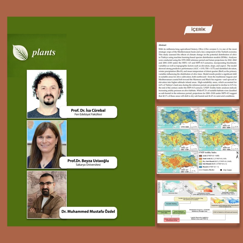 BAÜN akademisyenlerinden Prof. Dr. İsa Cürebal, Sakarya Üniversitesi akademisyenlerinden Prof.Dr. Beyza Ustaoğlu ve Doktora öğrencileri Dr. Muhammed Mustafa Özdel tarafından yürütülen “Climate-Driven Futures of Olive (Olea europaea L.) in Türkiye: Machine Learning-Based Ensemble Species Distribution Modelling of Northward Shifts Under Aridity Stress” başlıklı çalışma, uluslararası dergi sıralamasının en üst dilim olan Q1 ölçeğindeki MDPI Plants dergisinin "Special Issue Adaptation Strategies and Defense Mechanisms of Plants During Environmental Stress) başlıklı özel sayısında yayımlandı.