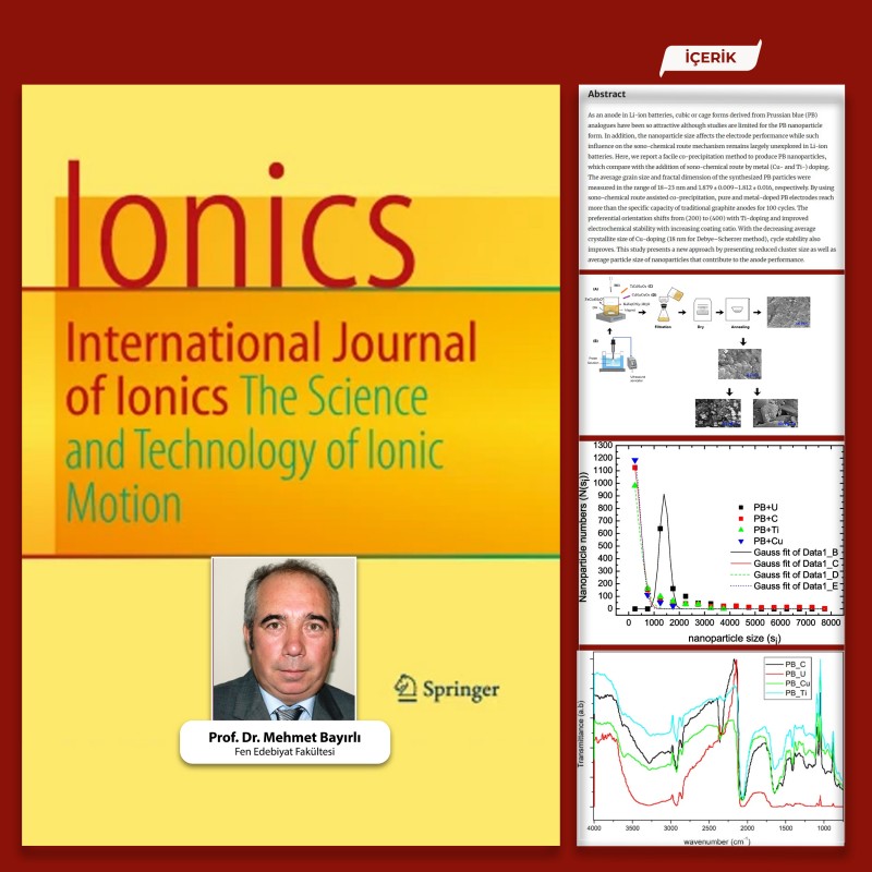 BAÜN akademisyenlerinden Prof. Dr. Mehmet Bayırlı, Çanakkale Onsekiz Mart Üniversitesi akademisyenlerinden Doç. Dr. Fatma Sarf ve Dr. Öğr. Üyesi EminYakar tarafından ortaya koyulan “Average particle size and cluster size of metal (M: Cu, Ti)-doped Prussian blue nanoparticles for Li-ion battery anode material” başlıklı çalışma, uluslararası dergi sıralamalarında en üst dilimlerinden olan Q2 ölçeğindeki “Ionics” dergisinde yayımlandı.