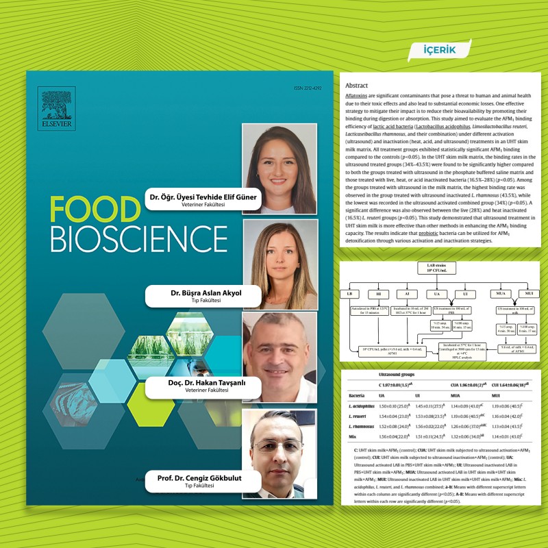 BAÜN Veteriner Fakültesi akademisyenlerinden Dr. Öğr. Üyesi Tevhide Elif Güner, Doç. Dr. Hakan Tavşanlı ile Tıp Fakültesi akademisyenlerinden Dr. Büşra Aslan Akyol ve Prof. Dr. Cengiz Gökbulut tarafından ortaya konulan “Effects of different inactivation and activation treatments applied to lactic acid bacteria on AFM1 detoxification in milk” başlıklı çalışma, uluslararası dergi sıralamasının en üst dilim olan Q1 ölçeğindeki “Food Bioscience” dergisinde yayımlandı.