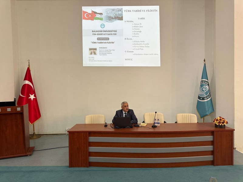 Balıkesir Üniversitesi Fen-Edebiyat Fakültesi tarafından Tarih Bölümü Başkanı Prof. Dr. Kenan Ziya Taş’ın konuşmacı olduğu “Türk Tarihi ve Filistin” konulu bir konferans düzenlendi. Fen-Edebiyat Fakültesi Şehit Ömer Halisdemir Konferans Salonu’nda gerçekleştirilen programa, Rektör Yardımcısı Prof. Dr. Fatih Satıl, Fen-Edebiyat Fakültesi Dekanı Prof. Dr. Halil İbrahim Şahin, akademisyenler ve öğrenciler katıldı.