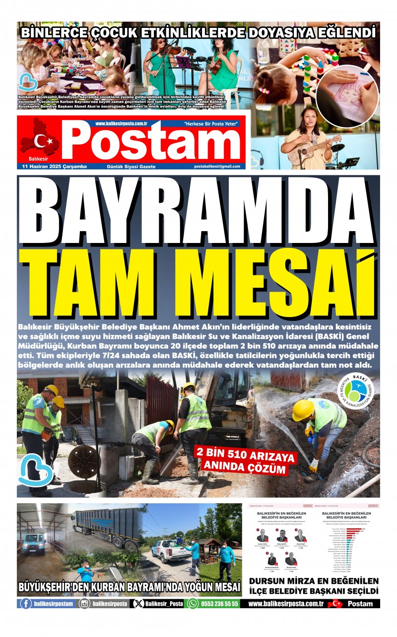Balıkesir Büyükşehir Belediye Başkanı Ahmet Akın’ın liderliğinde vatandaşlara kesintisiz ve sağlıklı içme suyu hizmeti sağlayan Balıkesir Su ve Kanalizasyon İdaresi (BASKİ) Genel Müdürlüğü, Kurban Bayramı boyunca 20 ilçede toplam 2 bin 510 arızaya anında müdahale etti. Tüm ekipleriyle 7/24 sahada olan BASKİ, özellikle tatilcilerin yoğunlukla tercih ettiği bölgelerde anlık oluşan arızalara anında müdahale ederek vatandaşlardan tam not aldı.