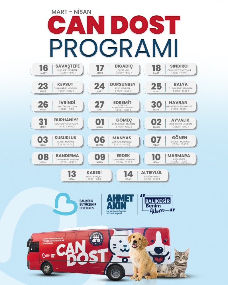 Sokakta zorlu şartlarda yaşamlarını sürdüren sahipsiz canlara bakım ve tedavi hizmeti sağlayan Balıkesir Büyükşehir Belediyesinin yerinde hayvan bakım ve tedavi aracı Can Dost, Mart- Nisan aylarındaki yolculuğuna 16 Mart’ta Savaştepe’den başladı. 17 Mart’ta Bigadiç’te sokaktaki patili dostlara sağlık hizmeti veren Can Dost Yerinde Hayvan Bakım ve Tedavi Aracı; 18 Mart’ta Sındırgı, 23 Mart’ta Kepsut ve 24 Mart’ta Dursunbey’de, 25 Mart’ta Balya, 26 Mart’ta İvrindi, 27 Mart’ta Edremit, 30 Mart’ta Havran ve 31 Mart’ta tarihinde Burhaniye’de olacak. 1 Nisan’da Gömeç ve 2 Nisan’da Ayvalık’ta yolculuğuna devam edecek olan Can Dost mobil tedavi ve bakım aracı 3 Nisan’da Susurluk, 6 Nisan’da Manyas, 7 Nisan’da Gönen, 8 Nisan’da Bandırma, 9 Nisan’da Erdek, 10 Nisan’da Marmara Avşa Adası’ndaki yolculuğunu 13 Nisan’da Karesi Millet Bahçesi ve 14 Nisan’da Altıeylül Atatürk Parkı’nda sokaktaki sahipsiz patili dostların bakım ve tedavilerini gerçekleştirecekç