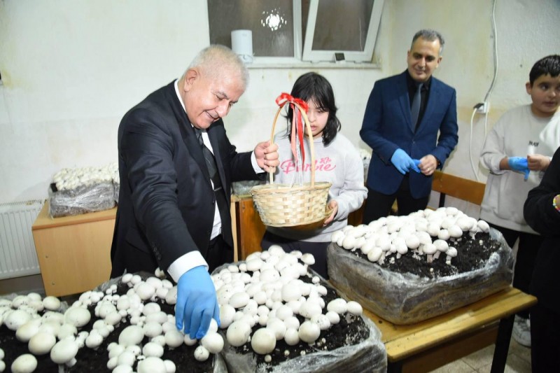 Protokol üyeleri öğrencilerle yakından ilgilenerek üretim süreci hakkında bilgi aldı, mantar üretim alanında incelemelerde bulundu ve ilk hasat sevincine ortak oldu. Öğrencilerin azmi, emeği ve üretme heyecanı takdirle karşılandı.