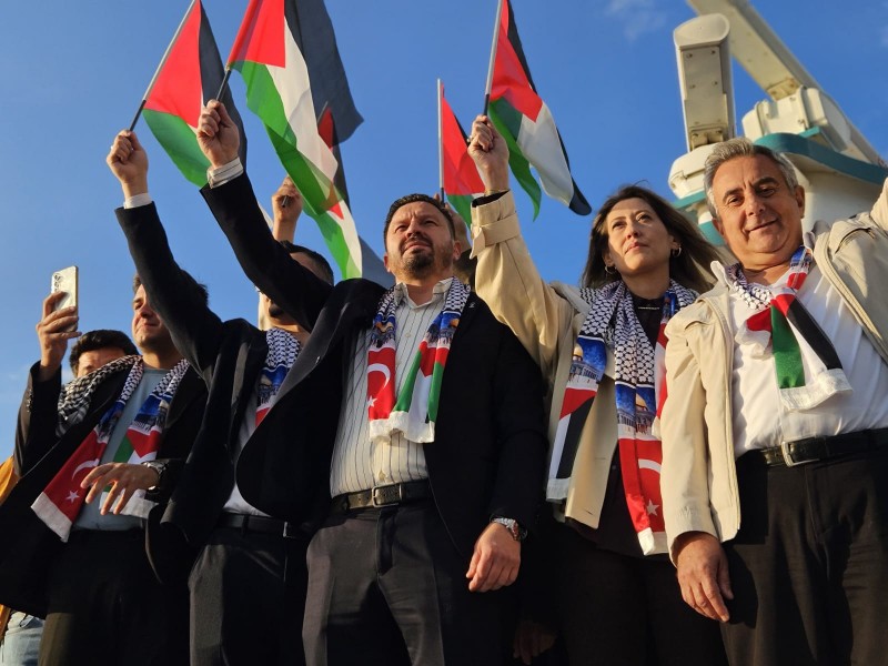 Katılımcılar, ellerinde Türk ve Filistin bayraklarıyla Gazze halkına destek mesajı verirken, limanda duygu dolu anlar yaşandı.