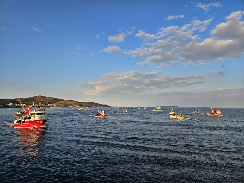 Türk ve Filistin bayraklarıyla donatılan gemi ve tekneler, Marmara sularında “vicdanın ve kardeşliğin” sesi oldular.