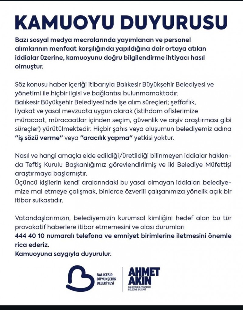 Söz konusu haber içeriği itibarıyla Balıkesir Büyükşehir Belediyesi ve yönetimi ile hiçbir ilgisi ve bağlantısı bulunmamaktadır. Balıkesir Büyükşehir Belediyesi’nde işe alım süreçleri; şeffaflık, liyakat ve yasal mevxuata uygun olarak (istihdam ofislerimize müracaat, müracaatlar içinden seçim, güvenlik ve arşiv araştırması gibi süreçler) yürütülmektedir. Hiçbir şahıs veya oluşumun belediyemiz adına “iş sözü verme” veya “aracılık yapma” yetkisi yoktur.