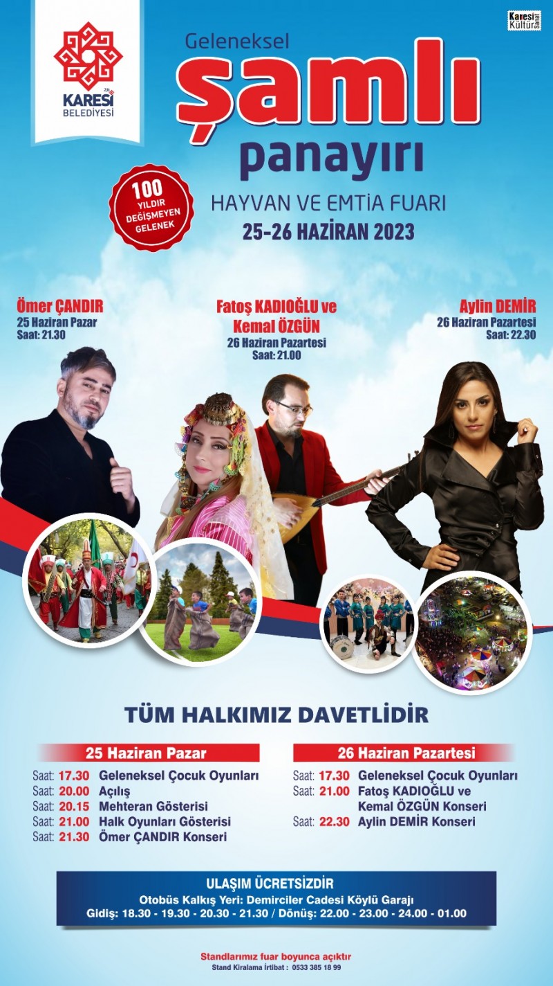 Farklı renklerin ve kültürlerin buluşma noktası olan Karesi’de Geleneksel Şamlı Panayırı Hayvan ve Emtia Fuarı, Şamlı Mahallesi’nde kapılarını açacak. 25-26 Haziran tarihlerinde Karesi Belediyesi katkılarıyla düzenlenecek olan panayırı 25 Haziran Cumartesi Günü saat 17.30’da Geleneksel Çocuk Oyunları ile başlayacak, saat 20.00’da ise açılış töreni düzenlenecek. Açılışta mehteran gösterisi ardından saat 21.30’da ise sanatçı Ömer Çandır konser verecek. Panayırın ikinci gününde ise saat 17.30’da Geleneksel Çocuk Oyunları yarışması yapılacak. Saat 21.00’da ise Fatoş Kadıoğlu ve Kemal Özgün, 22.30’da ise Aylin Demir konserde hayranlarıyla bir araya gelecek.