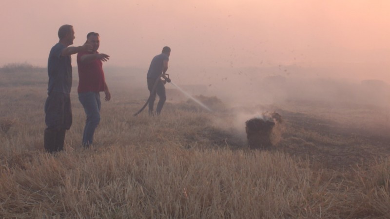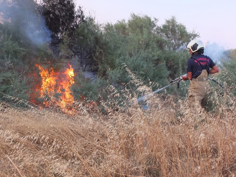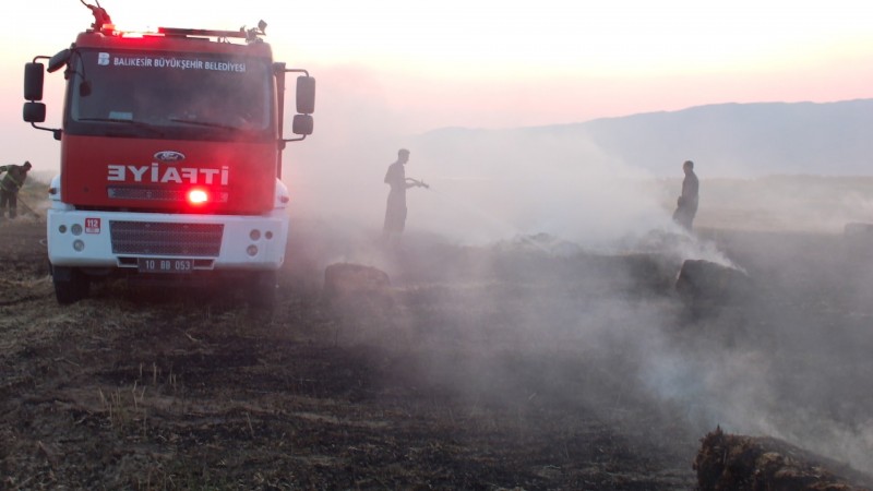 Ali Çetinkaya Mahallesi Orjan Tatil Sitesi yanındaki Kenan Karaköse’ye ait arazinin içinden geçen elektrik tellerine çarpan bir karganın neden olduğu kıvılcımlar anızlara sıçradı. Kısa sürede 30 dekarlık anız alanını küle dönerken, yangın bitişikteki çalılıklara da sirayet etti. Daha sonra Ali Zeybek’e ait tarlaya sıçrayan yangın tarlada bulunan saman balyalarını tutuşturdu. Yangına Burhaniye İtfaiyesi ile Orman İşletme Şefliğine ait yangın sündürme araçları ile müdahale edilirken, söndürme çalışmalarına bir yangın helikopteri de katıldı. Yangında, anızın yanında onlarca saman balyası da zarar gördü. Yazlıkları duman altında bırakan yangının söndürülmesi vatandaşlara rahat nefes aldırdı. (İHA)