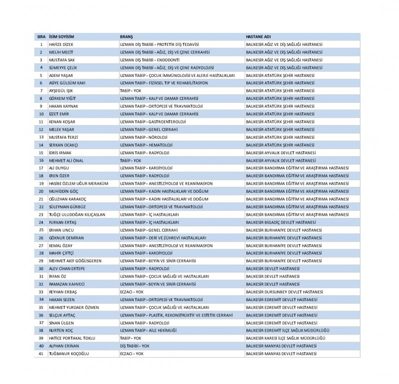 Aydemir, bu atamalarla birlikte Balıkesir’de Radyoloji, Ortopedi ve Travmatoloji, Anesteziyoloji ve Reanimasyon, Çocuk Sağlığı ve Hastalıkları, Genel Cerrahi, İç Hastalıkları, Kadın Hastalıkları ve Doğum, Kalp ve Damar Cerrahisi, Kardiyoloji, Plastik Cerrahi, Nöroloji, Fizik Tedavi, Deri ve Zührevi Hastalıkları, Aile Hekimliği, Gastroenteroloji, Hematoloji ve Çocuk İmmünolojisi gibi birçok branşta hekimlerin göreve başladığını ifade etti.