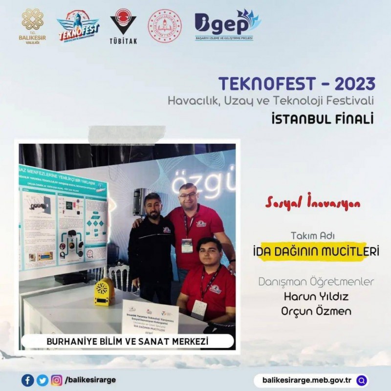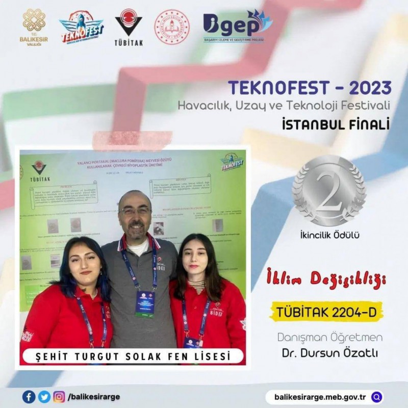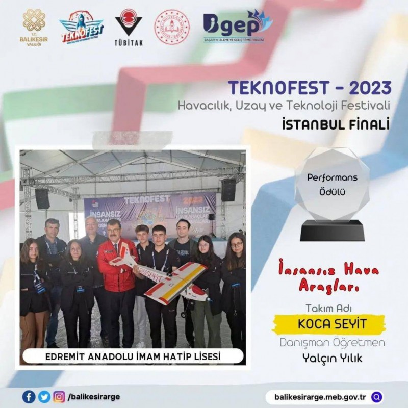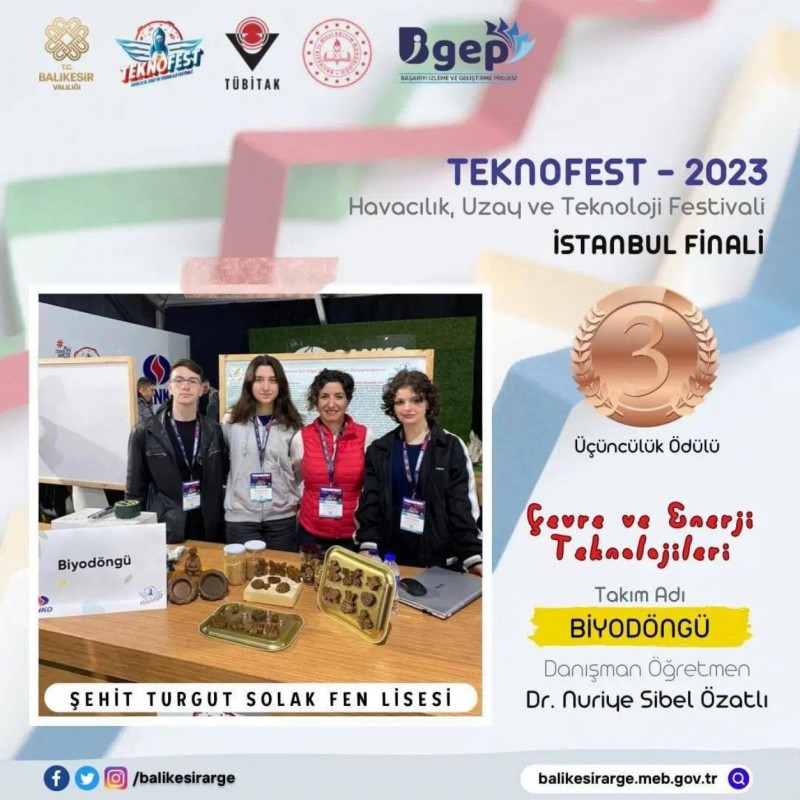 TEKNOFEST 2023 ödüllerinin sahiplerini bulduğu ödül töreninde, farklı yarışma kategorilerinde TEKNOFEST'e katılan ve Balıkesir'i gururla temsil eden Karesi Şehit Turgut Solak Fen Lisesi "İklim Değişikliği" alanında danışman öğretmen Dr. Dursun Özatlı öğrencisi Sude Uçar ile Türkiye 2.liği; "Çevre ve Enerji Teknolojileri" alanında danışman öğretmen Dr. Nuriye Sibel Özatlı öğrenciler Elifnaz Özçoban, Merve Işıl Kayabey, İsmail Arda Bayer ile Türkiye 3.lüğü; Edremit Anadolu İmam Hatip Lisesi "İnsansız Hava Araçları" alanında danışman öğretmen Yalçın Yılık öğrencilerimiz Arif Mete Işık, Nilsu Kars, Lina Duyar, Selim Çakır, Azra Bulduk, Reyyan Bulduk yapay zeka ile görüntü işlenerek kazazedelere ilk yardım ulaştırılması göreviyle performans ödülü, "Sosyal İnovasyon" alanında danışman öğretmenler Harun Yıldız (Burhaniye Bilim ve Sanat Merkezi), Orçun Özmen (Edremit Mesleki ve Teknik Anadolu Lisesi), Mustafa Selçuk (Halil İbrahim Fazlıca İlkokulu) öğrenciler Yiğit Ege Yeldağ, Mehmet Yekta Ege Kılınç ile Türkiye 3.lüğü elde ederek ödüllerini mutluluk ve heyecanla aldılar.