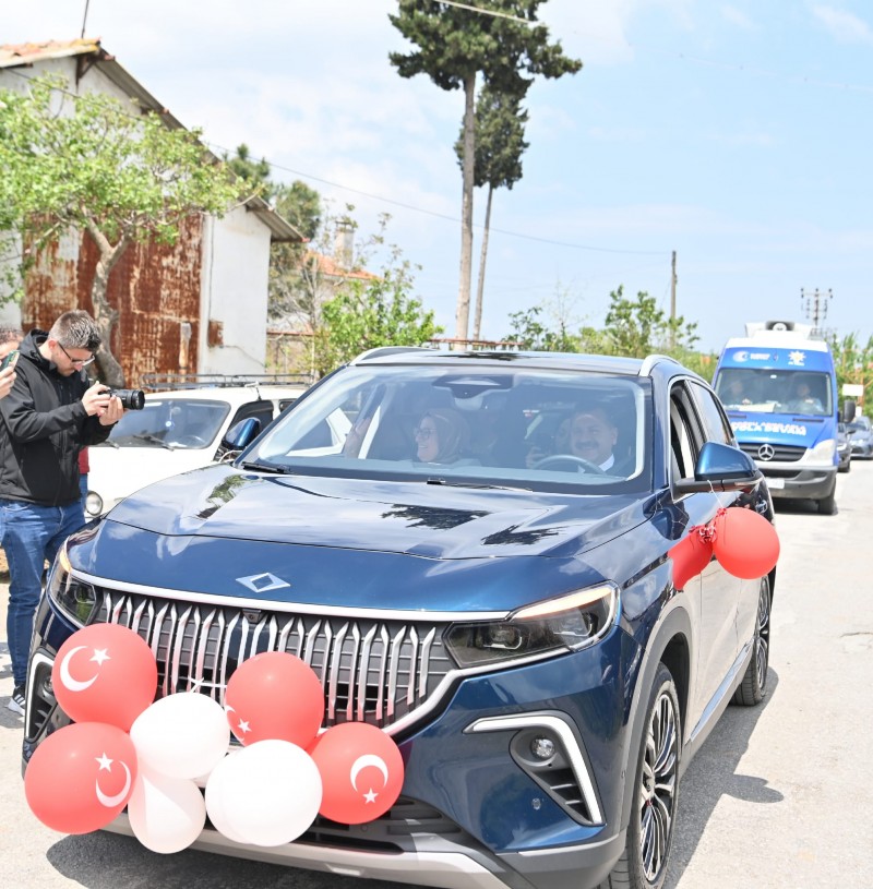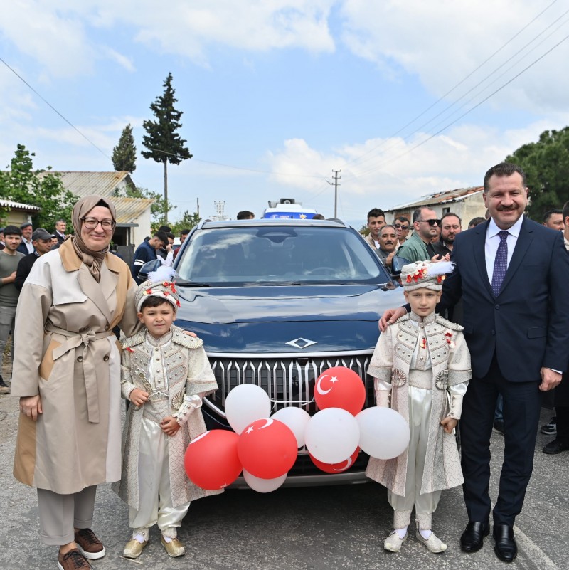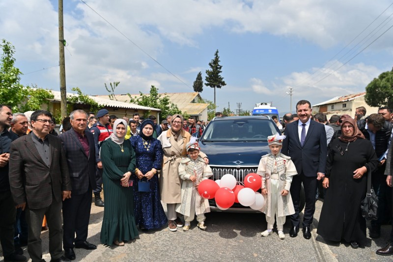 Türkiye’nin ilk yerli ve milli otomobili 10 BLK 10 plakalı TOGG, Bigadiç’in İlyaslar Mahallesi’nde Şehit Asb. Çvş. Niyazi Elçi’nin oğulları Metehan ve Alperen’in sünnet arabası oldu.